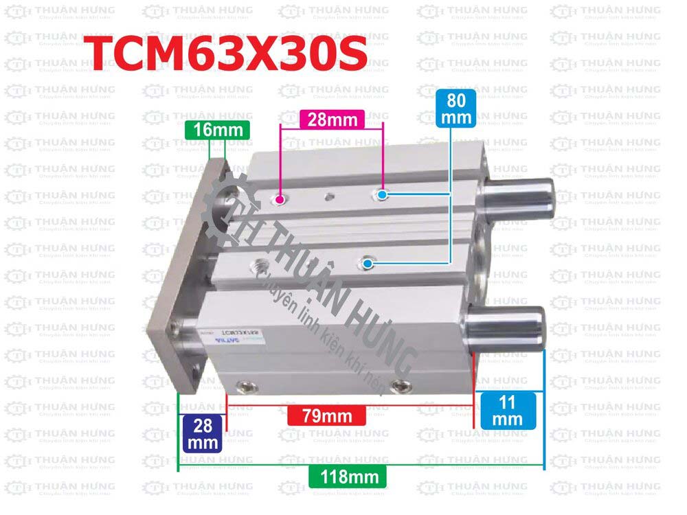 Kích thước của xi lanh 3 ty Airtac TCM12, TCM16, TCM20, TCM32, TCM40, TCM50, TCM63
